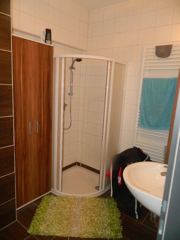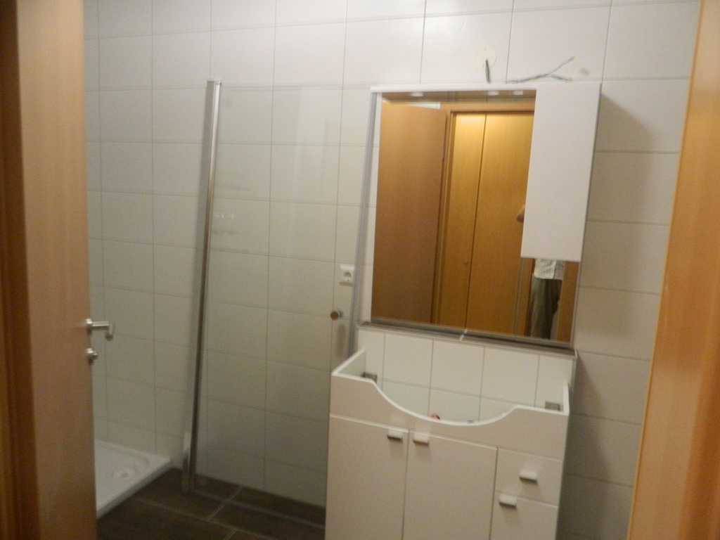 und im übrigen Wohnraum. Badezimmer ausgestattet mit Waschtisch, Spiegel, großer gemauerter Dusche, Wandheizkörper, Wasch-